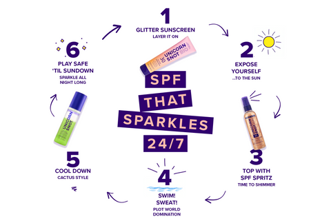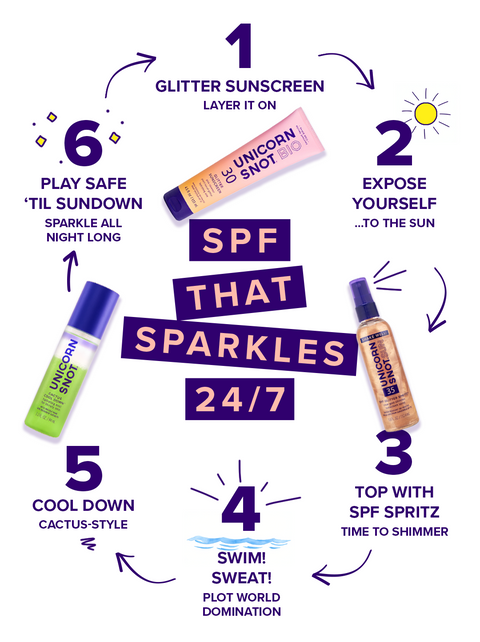 Get beach-ready with the SPF Summer Set! This fun set includes three products - the SPF 35 Glitter Spritz, SPF 30 Glitter Sunscreen Lotion, and the refreshing Cactus Cooldown after sun spray. With glitter infused SPF, you'll be protected while sparkling in the sun. (UV rays have met their match, darling!)